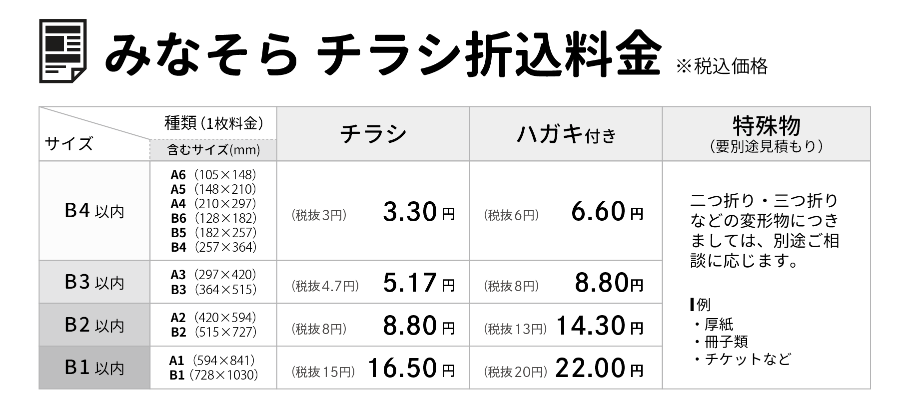 - 丁合の折り指定は、2割増しとなっております(B4サイズ以上)