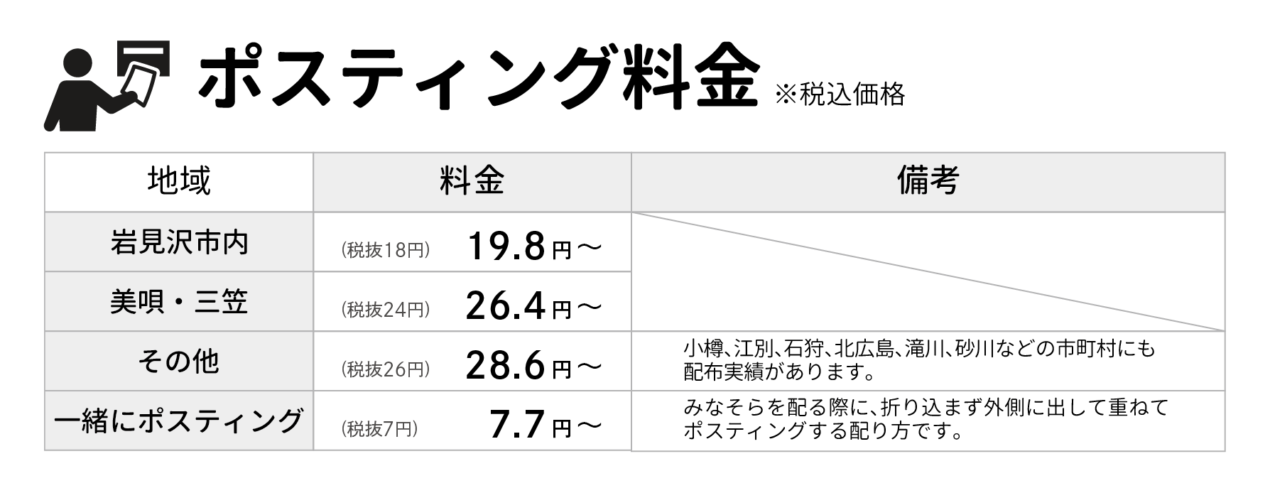 - 「一緒にポスティング」以外は、みなそらの折込とは別で「個別でポスティングを希望する場合」のポスティング料金です